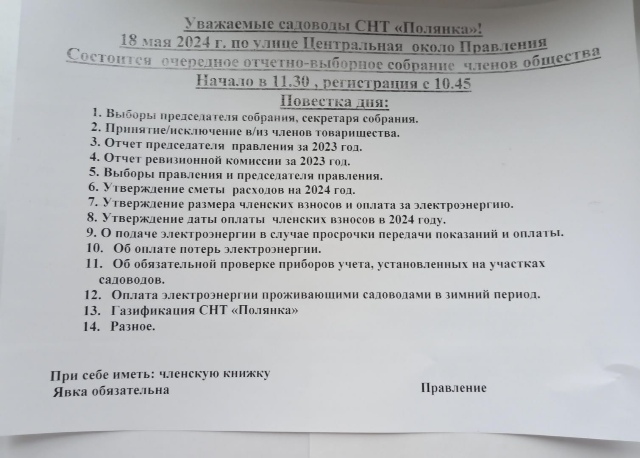 Сообщение о проведении общего собрания из группы вотсап "Полянка важные вопросы".